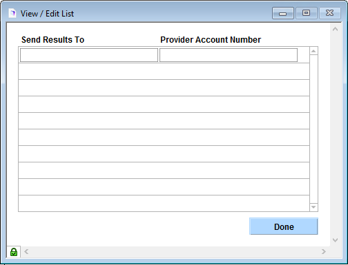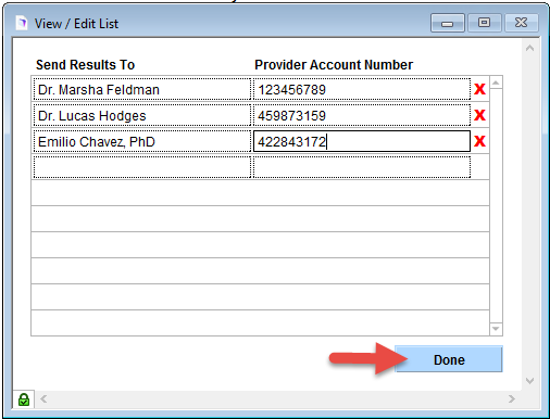 The View/Edit List popover will appear, permitting you to type in the name of the individual or organization receiving the results, as well as their Provider Account Number