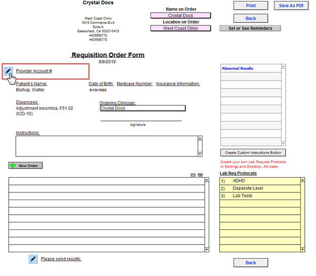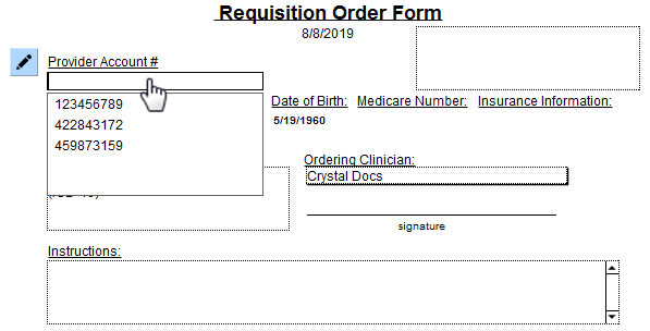 When creating a Requisition Order Form, Provider/Lab Account numbers can be saved and selected from the Provider Account # dropdown for easy inclusion without having to re-type the account number for each lab.