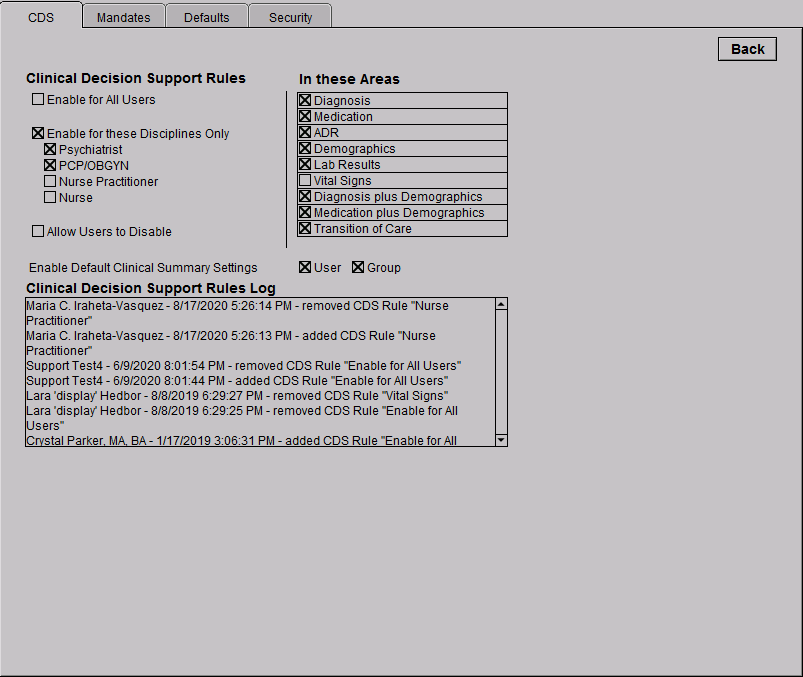 - Clinical Decision Support Rules Log: The audit trail of Security Administrator's changes to group rules.