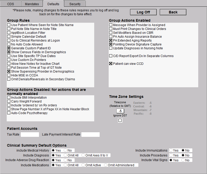 - Patient Accounts: Security Administrators can add a tax rate and/or late payment interest rate if desired. These are left blank as default.
