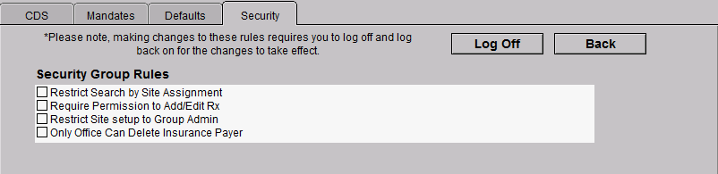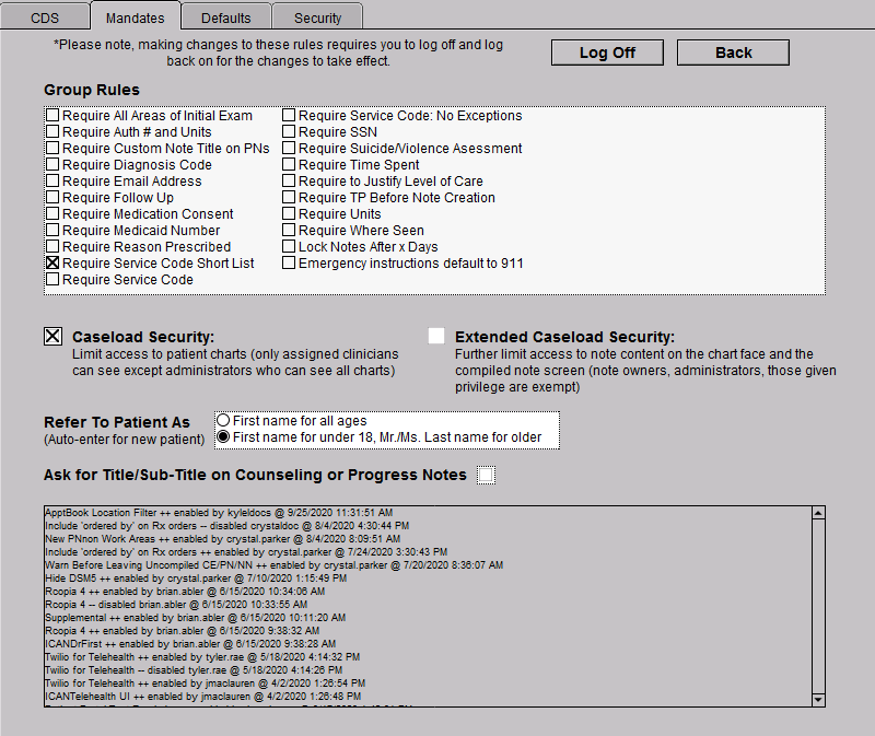 - Caseload Security: Checking this box prevents all clinicians from viewing charts they are not assigned to. The exception is group administrators, who can view all charts. This rule is only enabled on request.