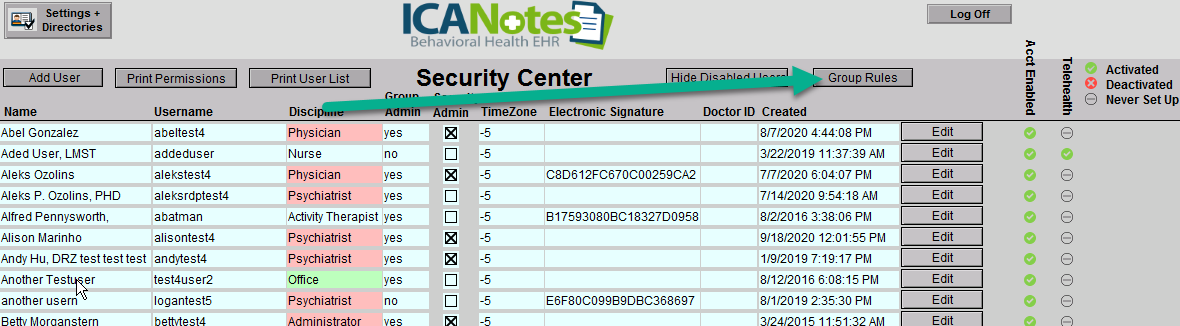 The ICANotes Security Center is available to users designated as Security Administrators for their group. 1. To access the Security Center, go to 'Settings + Directories' from the Chart Room. 2. Click the 'Security Center' button at the bottom. 3. ...