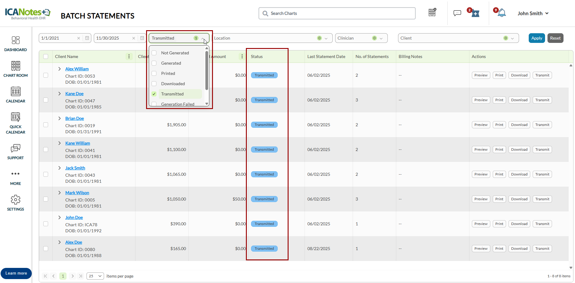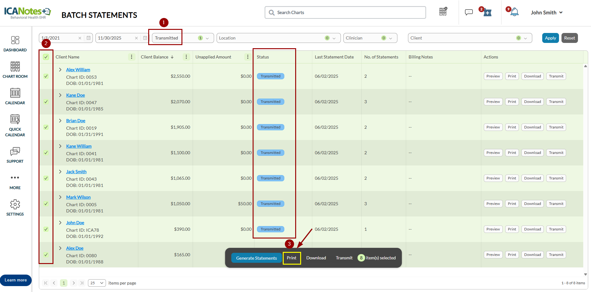 For example, select Transmitted to view all transmitted statements. You can then select multiple statements and print them at once.