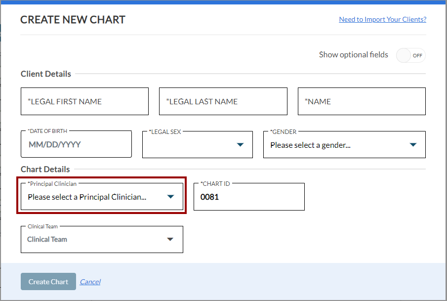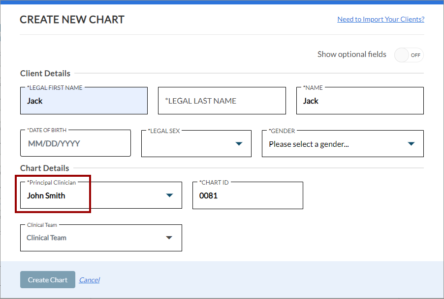 If the checkbox is unchecked, you will need to manually select the Principal Clinician from the dropdown menu when creating a chart.