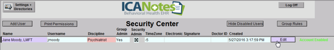 4. In the Security Center, find the name of the clinician, then click on the edit button next to the name.
