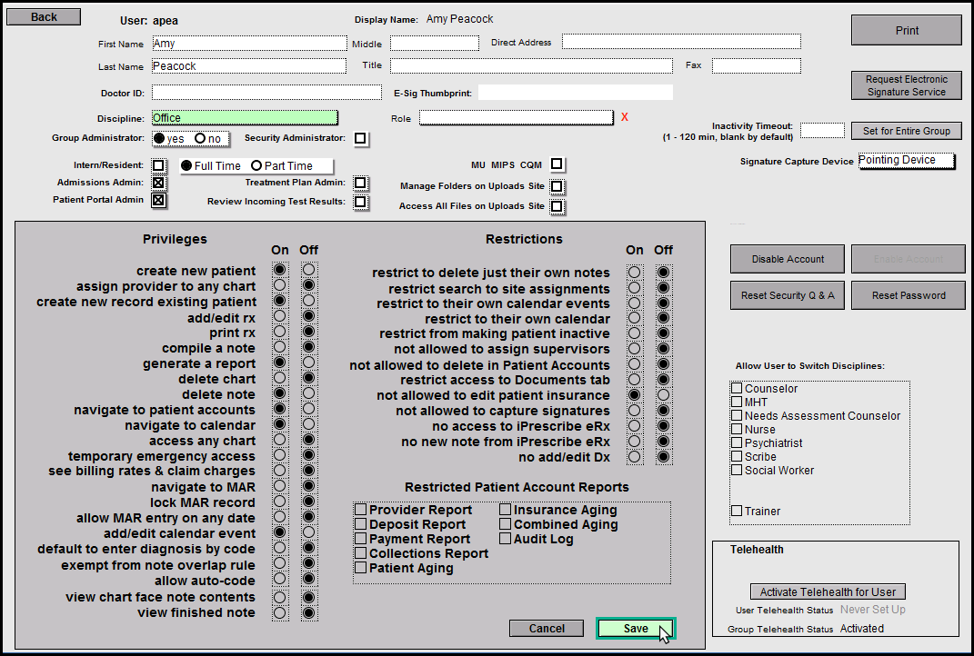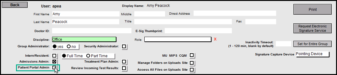 This user is now ready for Patient Portal Admin functionality. Click Back at the top left to return to the Security Center.