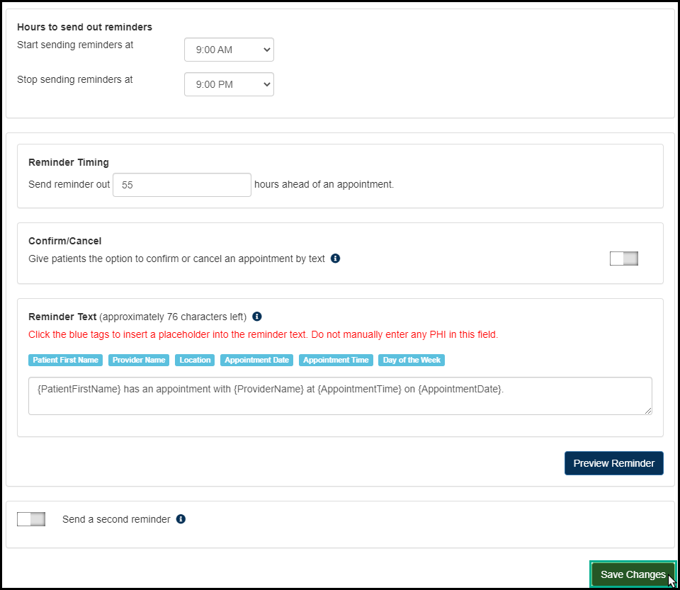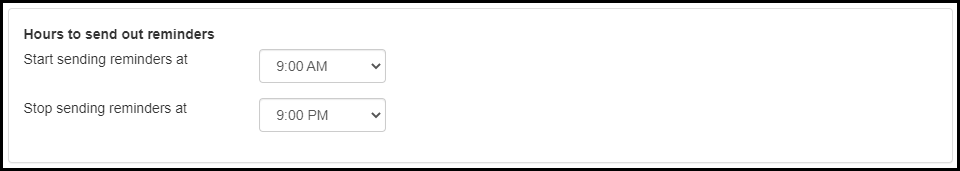 3. Hours to Send Reminders applies to all of the SMS Messages sent out by your practice. Make changes to the hours you want reminders sent out using the arrow buttons in each field to adjust the time.