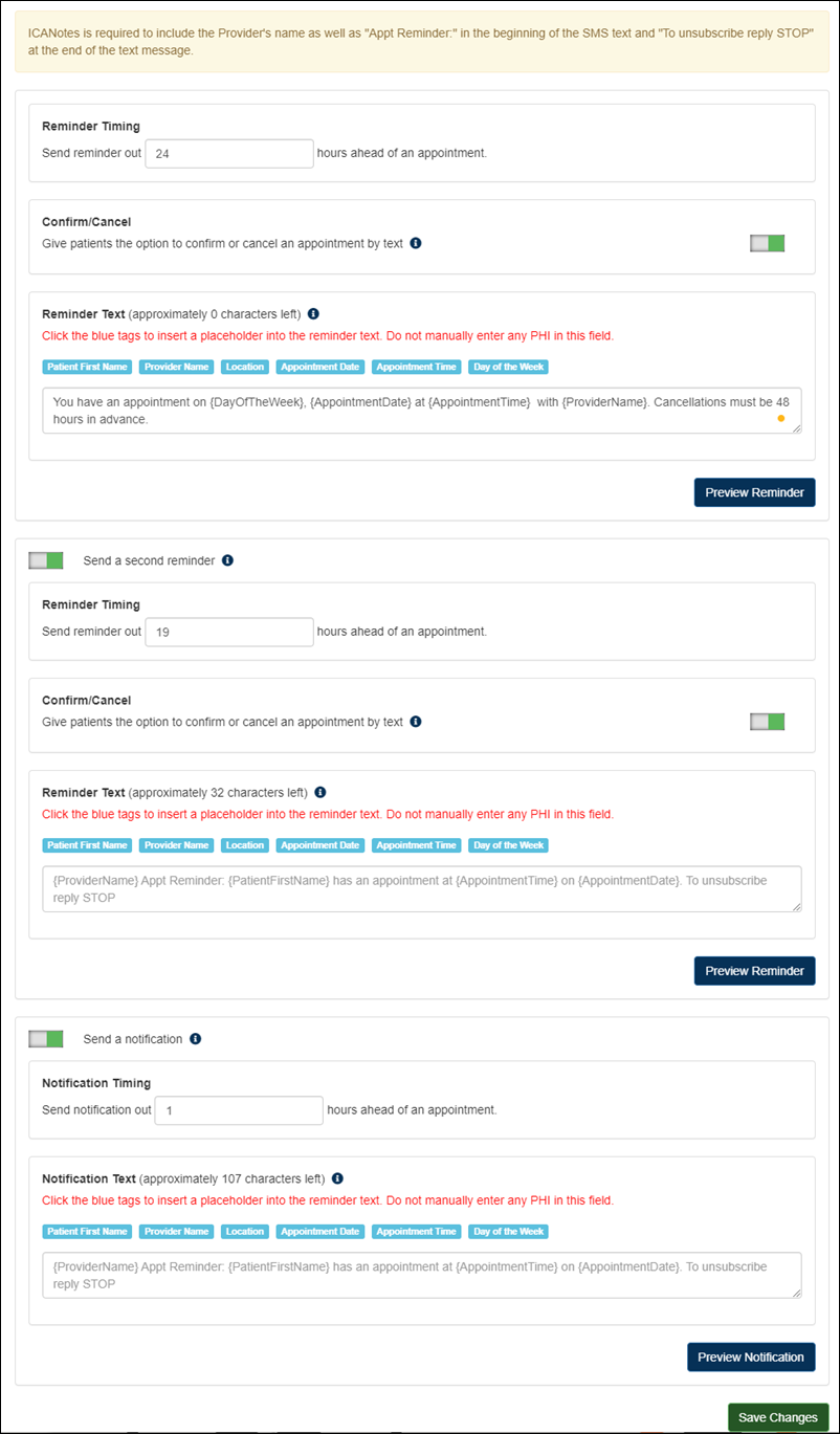 ICANotes is required to include the Provider's name as well as "Appt Reminder:" in the beginning of the SMS text and "To unsubscribe reply STOP" at the end of the text message.
