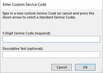 Click into the dropdown to select from a full list of service codes. To add a custom code, click into the field and type any letter. Upon doing so, you’ll be prompted to enter the 5-Digit Service Code and Descriptive Text.