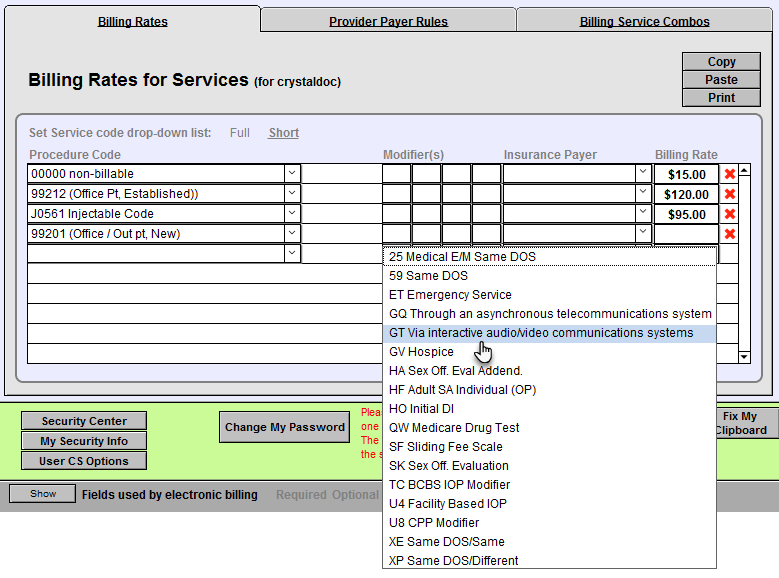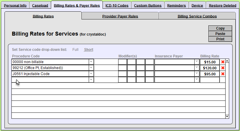Use the Copy and Paste buttons to apply the billing rates to multiple user accounts. Or, if billing rates and/or payers will differ between clinicians, follow the steps outlined above to build additional rules for other users.
