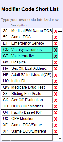 In the Modifier Short List column, use the next available line to type your telehealth modifiers.