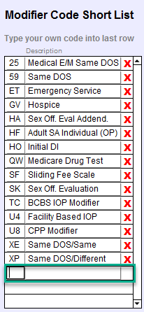 Select a code from your service code short list the Procedure Code dropdown menu, then tab into the Modifier field. Your Modifier Short List will pop-down to present you with all available options.