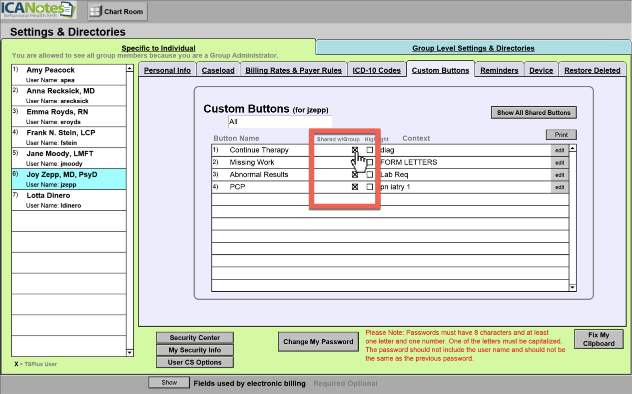In Settings + Directories, there is now a Custom Button tab under the Specific to Individual tab. Your entire list of custom buttons, and their locations, are listed on this tab. Check the Share checkbox next to any custom button, and it is shared with everyone in your group. You can see only shared buttons if you click on the button labeled Show All Shared Buttons.