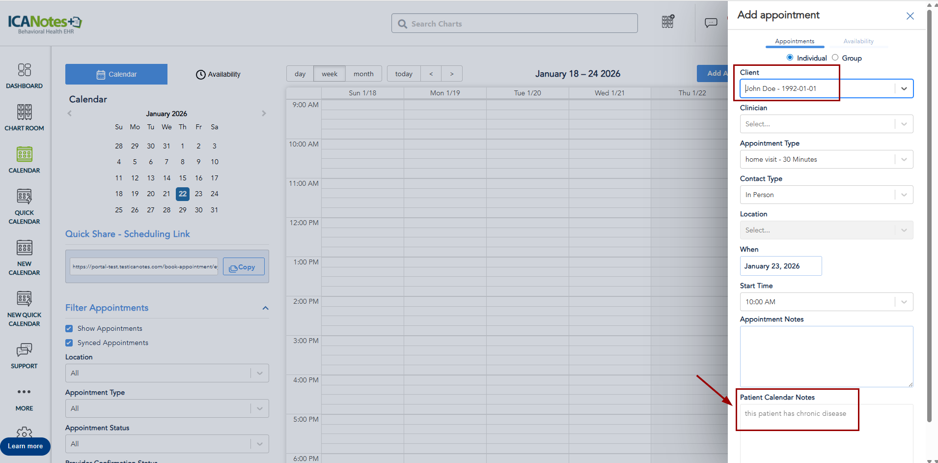 The Patient Calendar Notes field is available in the client chart.