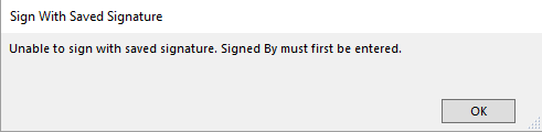 If when signing you receive the following prompt ("Unable to sign with saved signature. Signed By must first be entered") return to the compiled note and click into the dropdown field ("signed by") to select the type of signature first