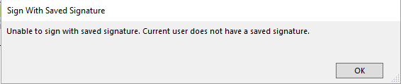 If when signing you receive the following prompt ("Unable to sign with saved signature. Current user does not have a saved signature") first try logging out from the