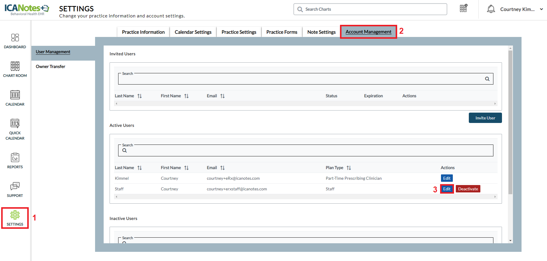 Overview This article explains how to enable e-prescribing (eRx) access for a staff user in ICANotes+. Before assigning eRx access to staff, ensure that at least one prescriber is already configured for e-prescribing. For details on setting up eRx ...