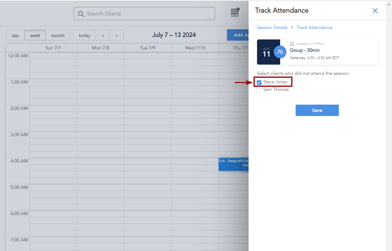 Clicking the Track Attendance button opens the following screen. Select the participant who did not attend the session and click Save.