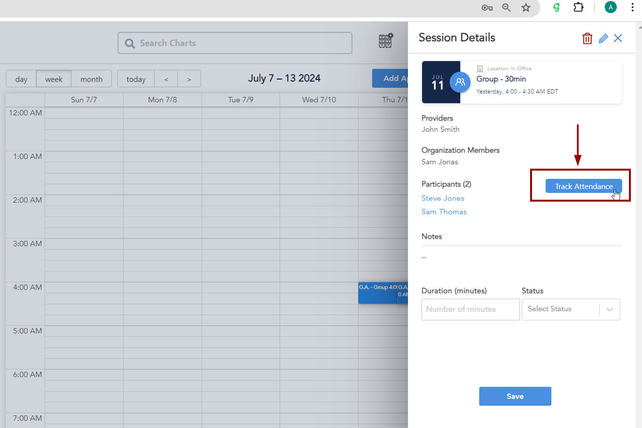 To mark a participant as absent in the group appointment, navigate to Calendar > Group Appointment and click the Track Attendance button as shown below: