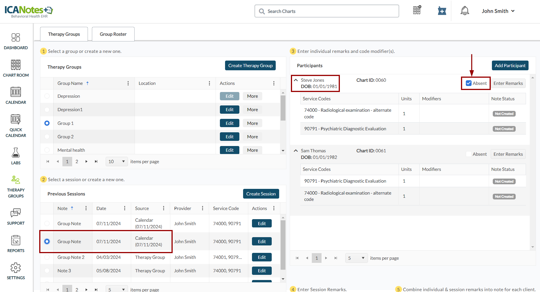 When you mark a participant as absent in a group appointment, the system will automatically reflect this absence in the therapy group session. Conversely, marking a participant as absent in the therapy group session will also automatically update the group appointment to show the participant as absent.