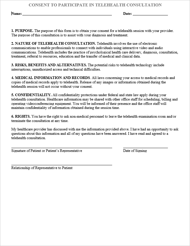 Telehealth consent varies by each state and payer source. Below are two sample Telehealth Consent forms. (Click on the form for a downloadable copy.)