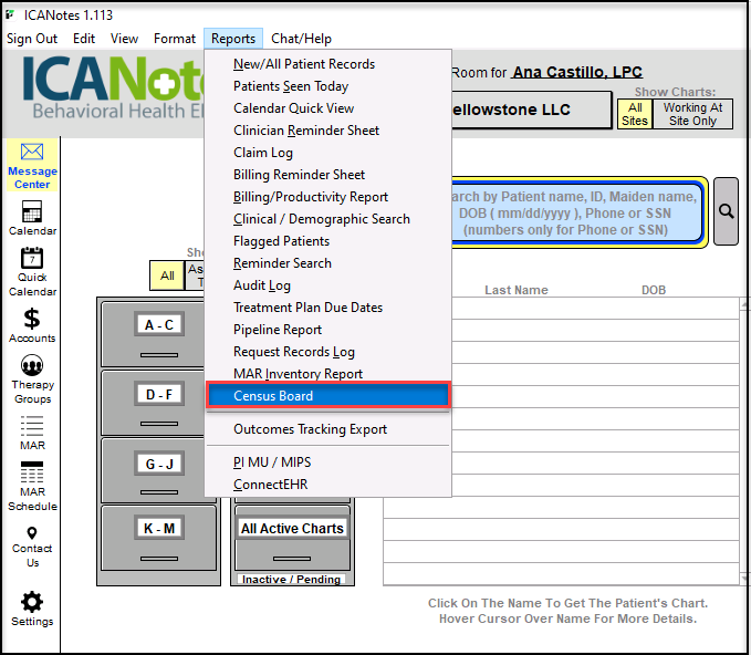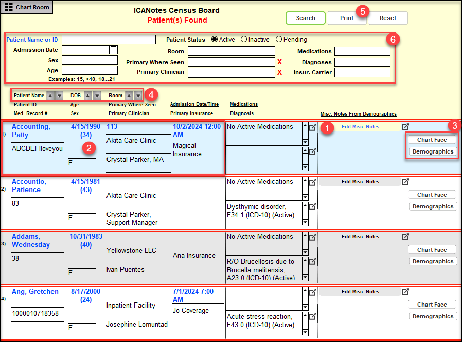 The Census Board is designed for In-Patient and Residential facilities to allow them to quickly search for, view and print essential information about patients on their unit(s).