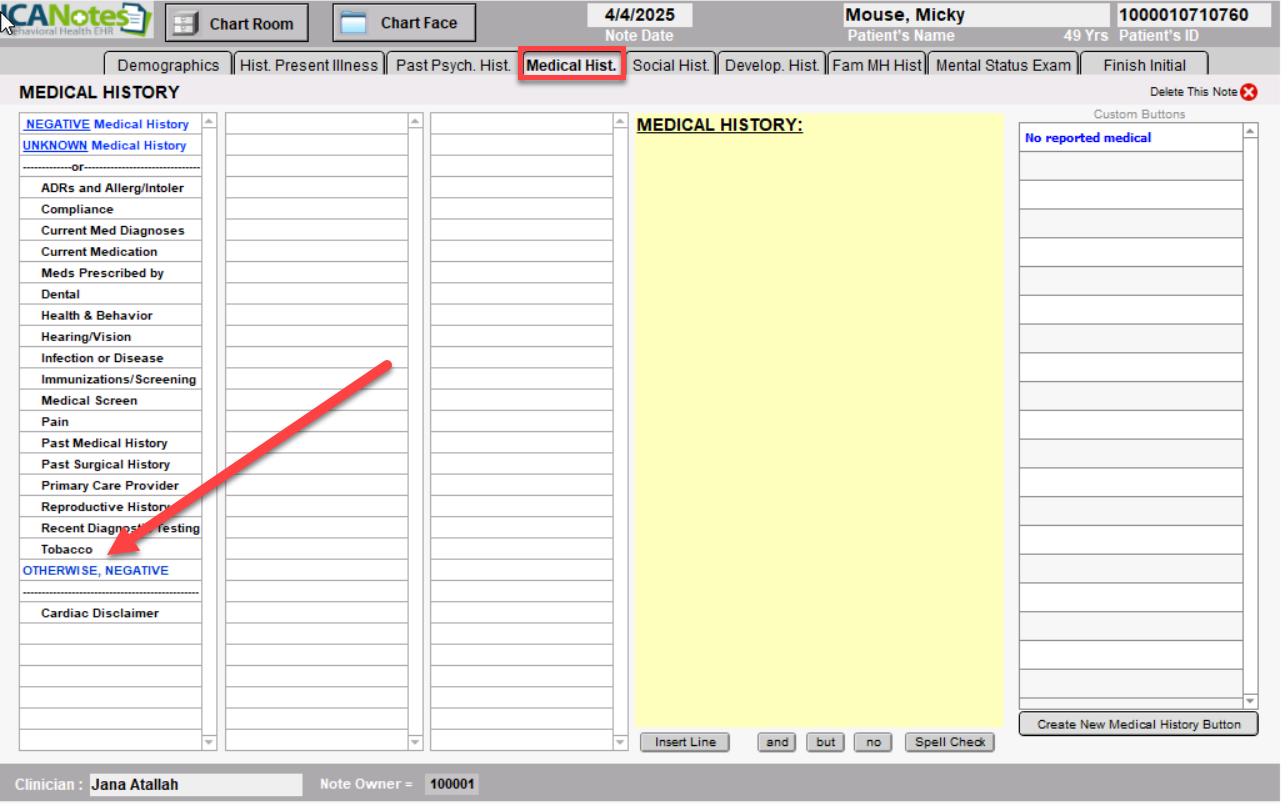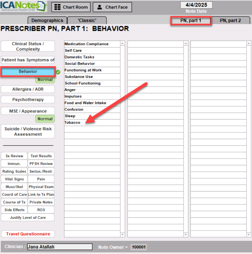 For a Prescriber Progress Note, access through the PN, part 1 tab and click the Behavior button at the bottom of the section choose the Tobacco button.