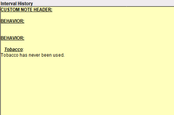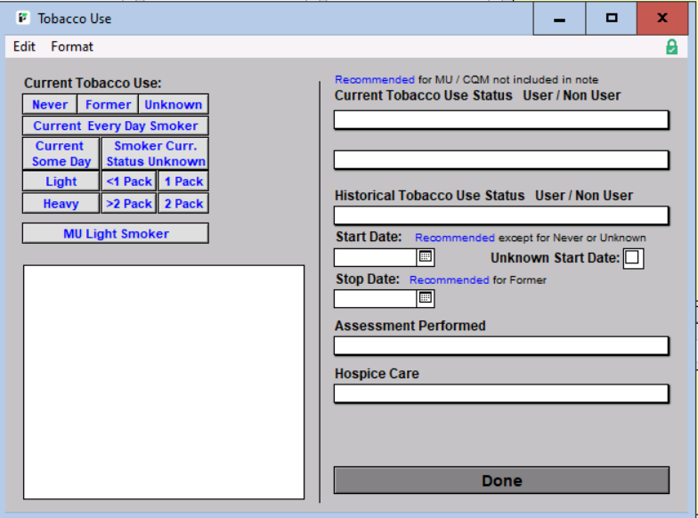 This is an example of a filled in Tobacco Use window. Click Done when you're finished to return to the previous note work area.