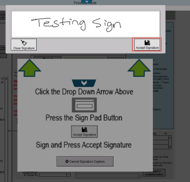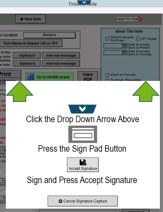 From the compiled note screen you will select from the three available drop downs determining who is signing the note. Once a selection is made from the dropdown filed, click to Capture Signature.