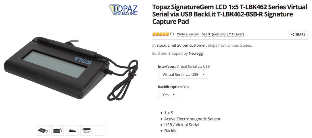 Prices range from $356 to $440.00. Topaz signature pads should be purchased from an authorized reseller to ensure that a warranty is available.