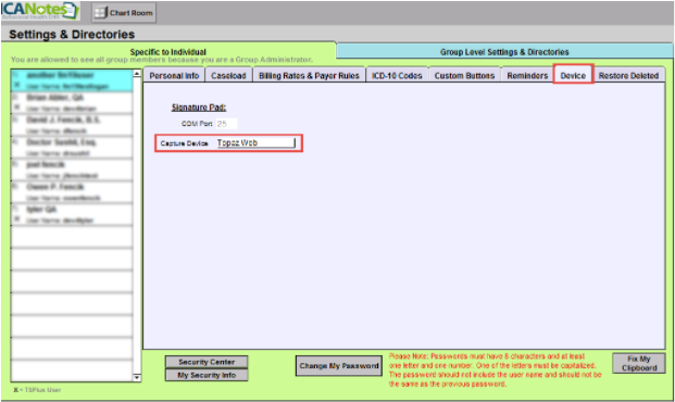 Login to your ICANotes account at https://ehr.icanotes.com. From the Chart Room navigate to the Device tab in your individual Settings and Directories.