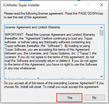 Run the .exe file and accept the terms presented by Topaz and ICANotes.