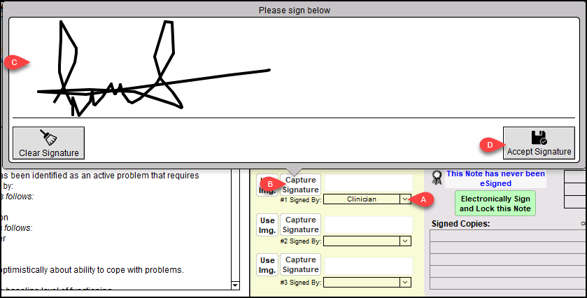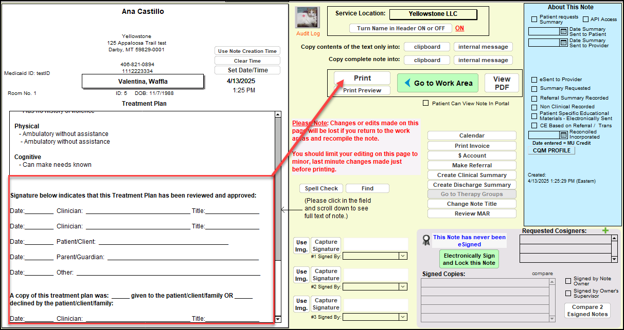 5. If you have been requested to sign a document. Go to the Compiled Note from the Chart Face (or Work Areas to review the Treatment Plan). Once you are satisfied with the note, click the Electronically Sign and Lock this Note button. You will note that under Requested Cosigners a checkmark will appear by your name and under Signed Copies the date, time, and your name will show.