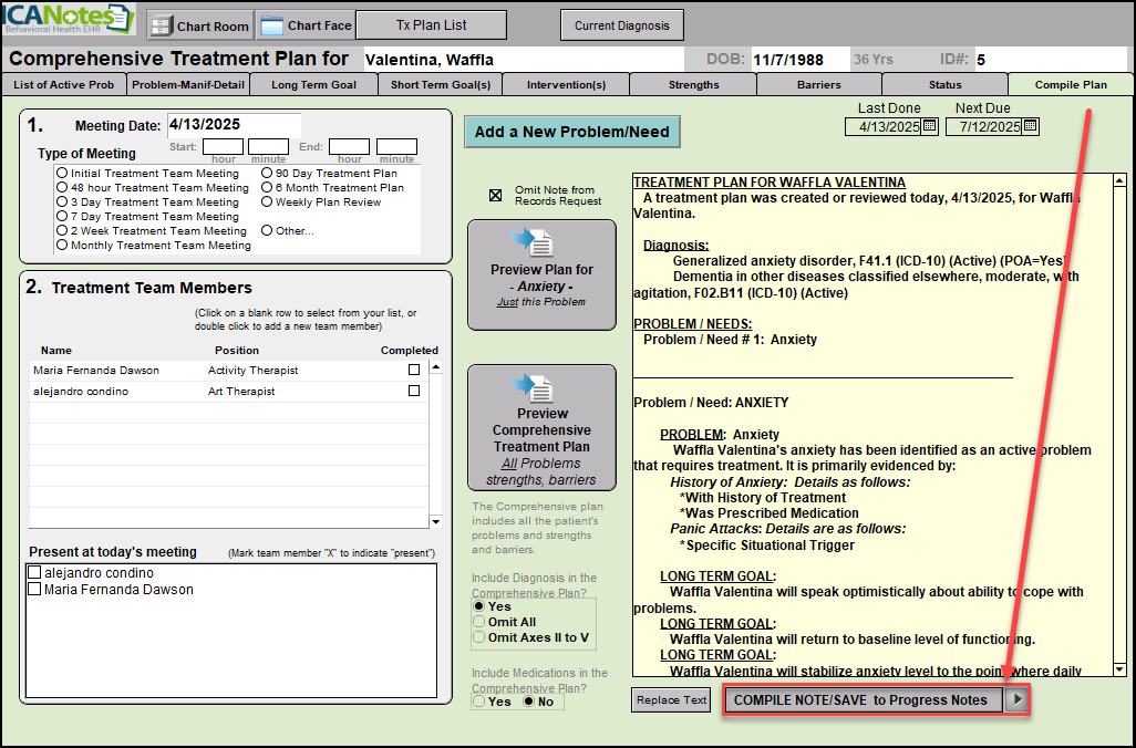 1. To get to the signature fields on your Treatment Plan, from the last tab (Compile Plan), click the COMPILE NOTE/SAVE to Progress Notes button.