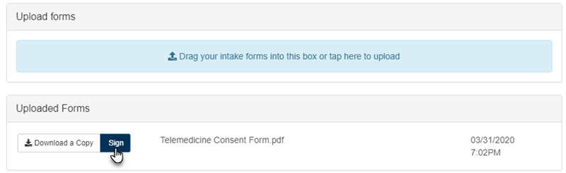 The patient will first click to Download the form to the computer to review as necessary. When finished, they'll save the form and Upload it back to their chart by clicking in the blue area above.