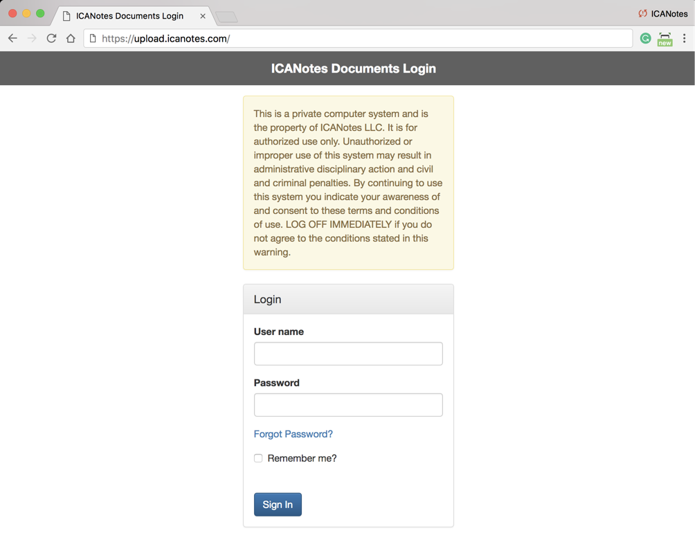 As a Patient Portal Administrator, go to the ICANotes upload site and Sign In with your credentials.