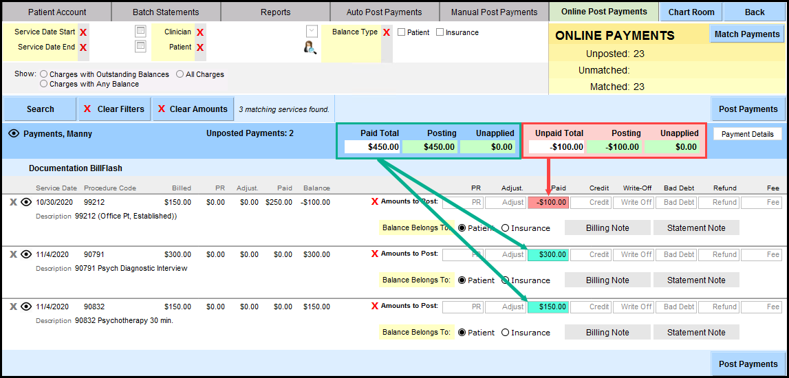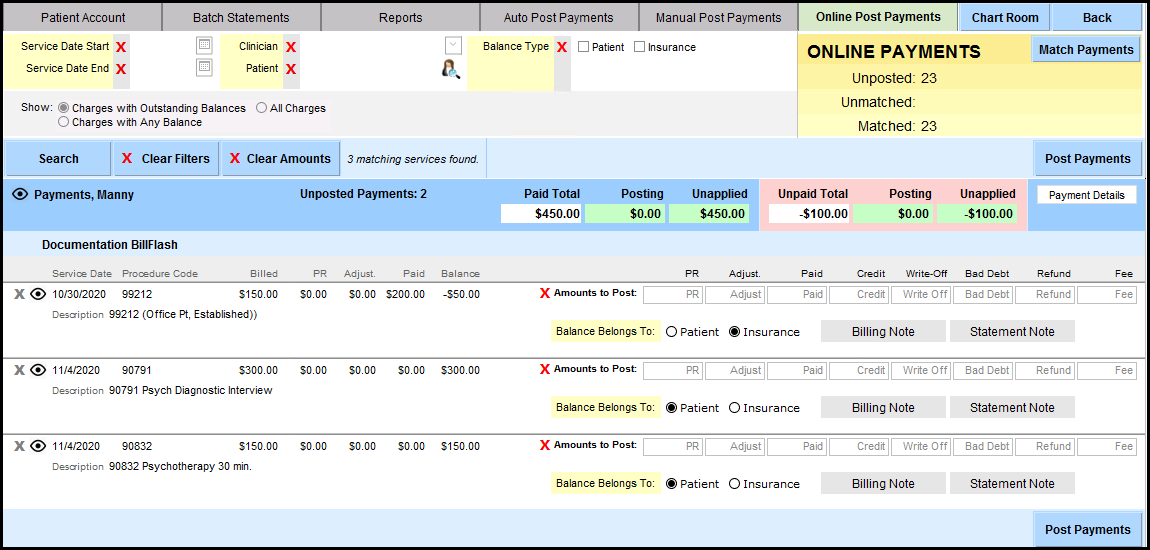 4. Services will show for the patient or patients based on the filters used. Typically, most of the posting will be done for Paid Totals. You may need to post a negative amount if there is a reversed charge, recoup or bounced check.