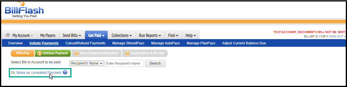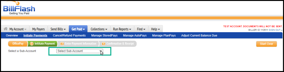 10. Follow the instructions shown above (in step 4) to select a site. In this scenario, you do not need to enter the patient's name or account number; however, make notes under messages to assist the biller in identifying the patient within ICANotes. Fill out following steps 5 and 6 above.