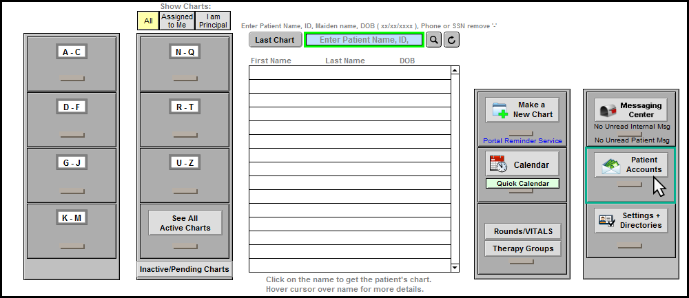 1. From the Chart room, click the 'Patient Accounts' drawer.
