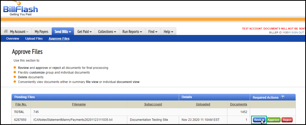 7. Log in to your BillFlash account and click on the “Send bills” tab and select Approve Files from the dropdown menu.