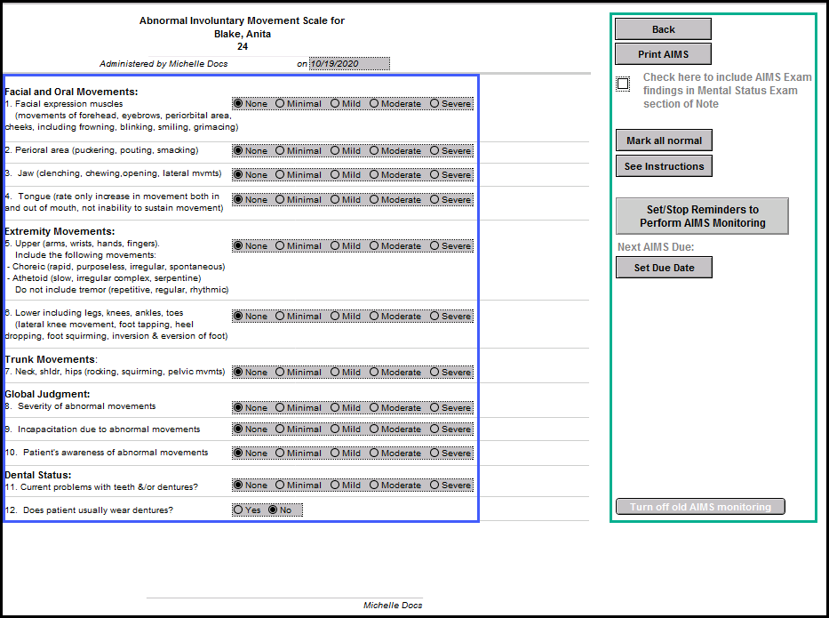 C. Checking this box will populate the content of the AIMS Scale into your note. If this box is not checked, there will be a line entered indicating that the AIMS Exam was performed. There will also be a prompt asking if you would like to always populate this content.
