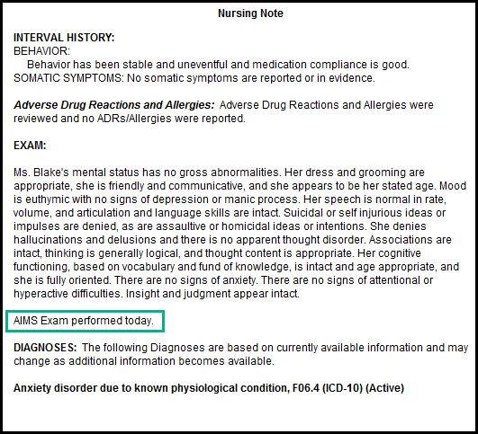 When results are not included, a comment stating that the AIMS Exam was performed will populate.