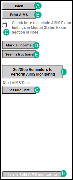 F. The Set /Stop Reminders button will allow you to access the Reminders section of the chart to either set or stop a reminder to perform the AIMS Exam. The Reminder will be set to you via the Messaging Center.