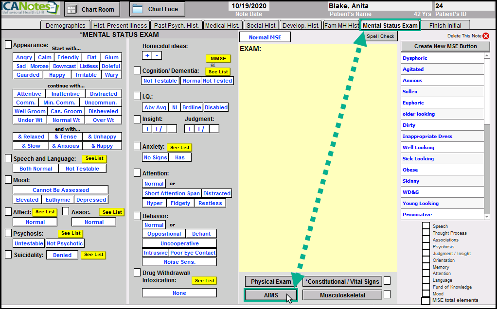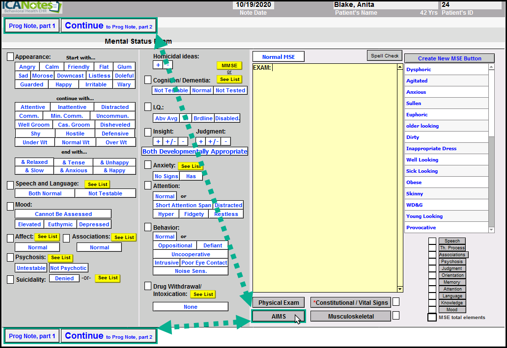 The AIMS button will be toward the bottom of the page, below the textable field. Return to the main note from the Mental Status Exam by clicking on 'Prog Note, part 1' or 'Continue to Prog Note, part 2' located at the top or bottom of the right-hand side of the screen.