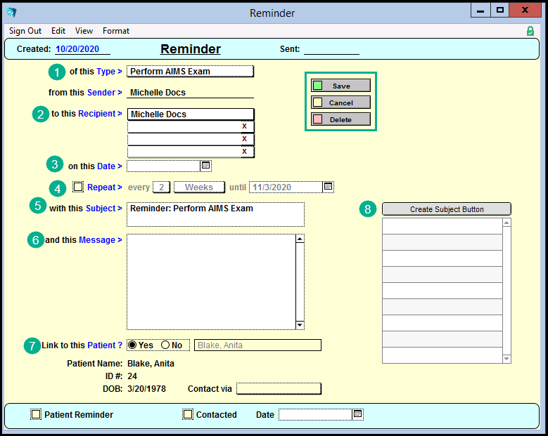 1. The Reminder type will be pre-populated, you can change this is you would like.