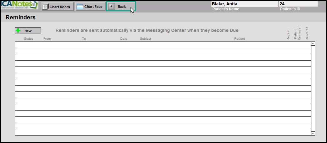 Once you have entered your Reminder information Click Save. If you decide you do not wish to save your reminder, click Cancel. Both option will direct you to the Reminders page. Click Back to return to your note.