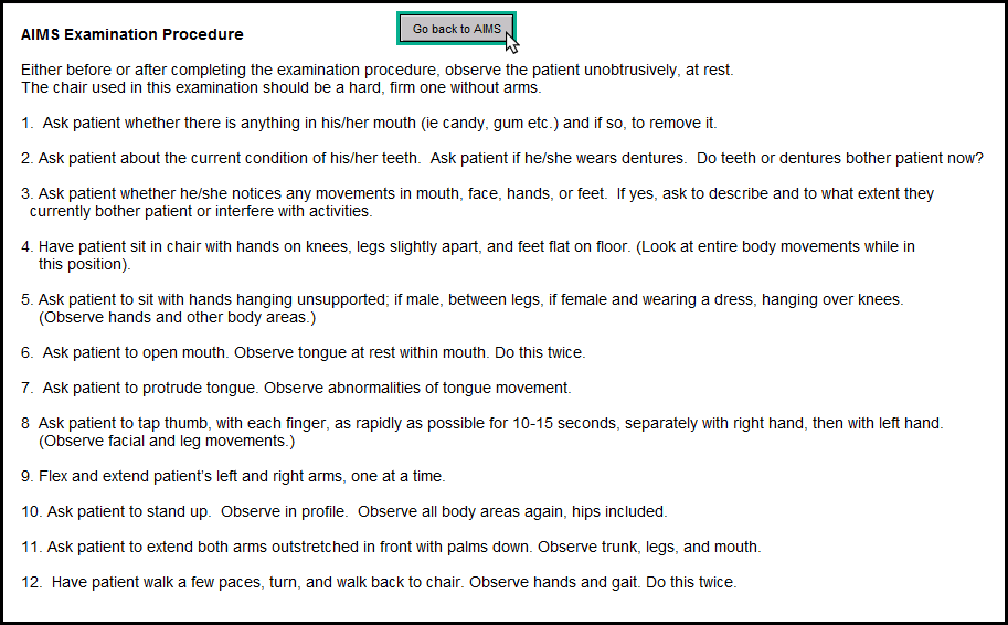 E. The See Instructions Button will allow you to review the instructions for using the AIMS Scale. Click the Go back to AIMS button to return to the AIMS Scale.