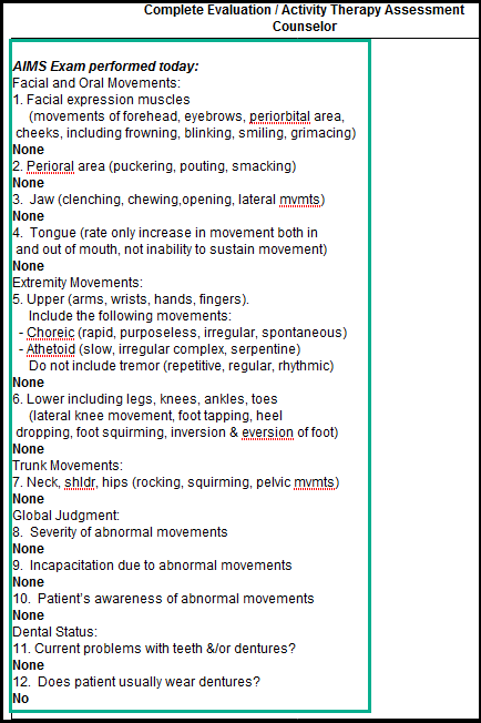When the box is checked to include the results of the AIMS Exam in the note, this is how that information will appear (shown in a Complete Evaluation):