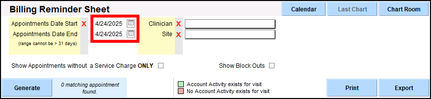 Checking will only show appointments scheduled for patients who do not have any charge recorded in their patient account. Checking will include any blocked out time on a clinician’s calendar in this report. These are filtered out by default because they are not typically associated with a patient appointment. Here is what a generated Billing Reminder Sheet may look like: