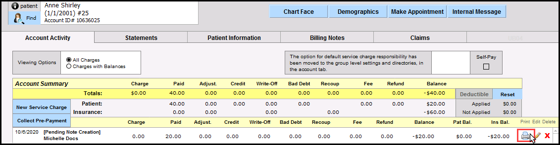 11. Optional: Print out receipt for client by clicking the print icon next to the service.